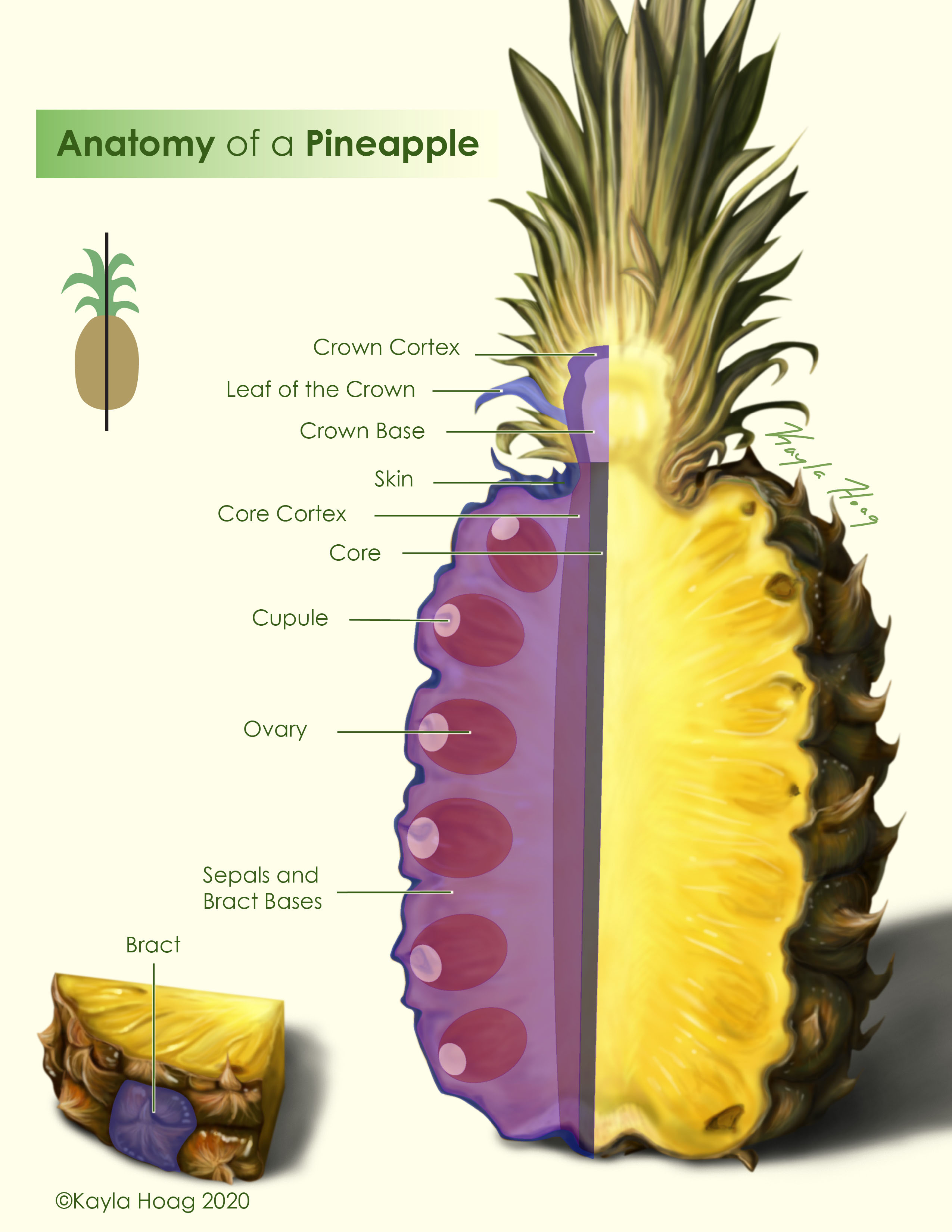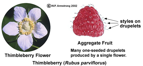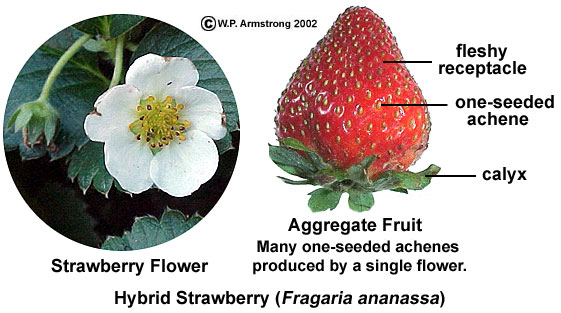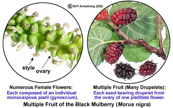 Fig 9: Origen de los tipos de fruto. Las partes rosadas son las corolas de las flores y las partes verdes son los pistilos, cada pistilo consiste en un ovario en forma de huevo con su estilo en forma de cuello y un estigma dividido. Tomado de Conrad (2023).