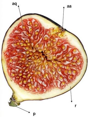 Fig 37: Sicono de Ficus carica. pedúnculo (p), abertura apical (aa), receptáculo (r), aquenio (aq). Tomado CASF (2010).