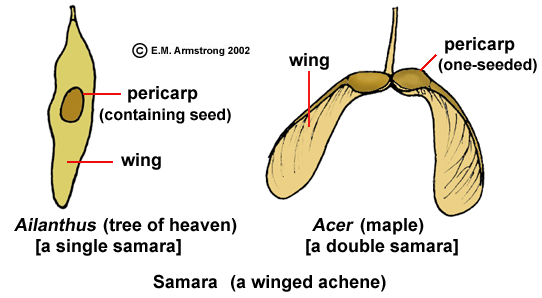 Fruto seco e indehiscente con un ala (más larga que la parte que lleva la semilla) desarrollada hacia un lado. Beentje (2016).