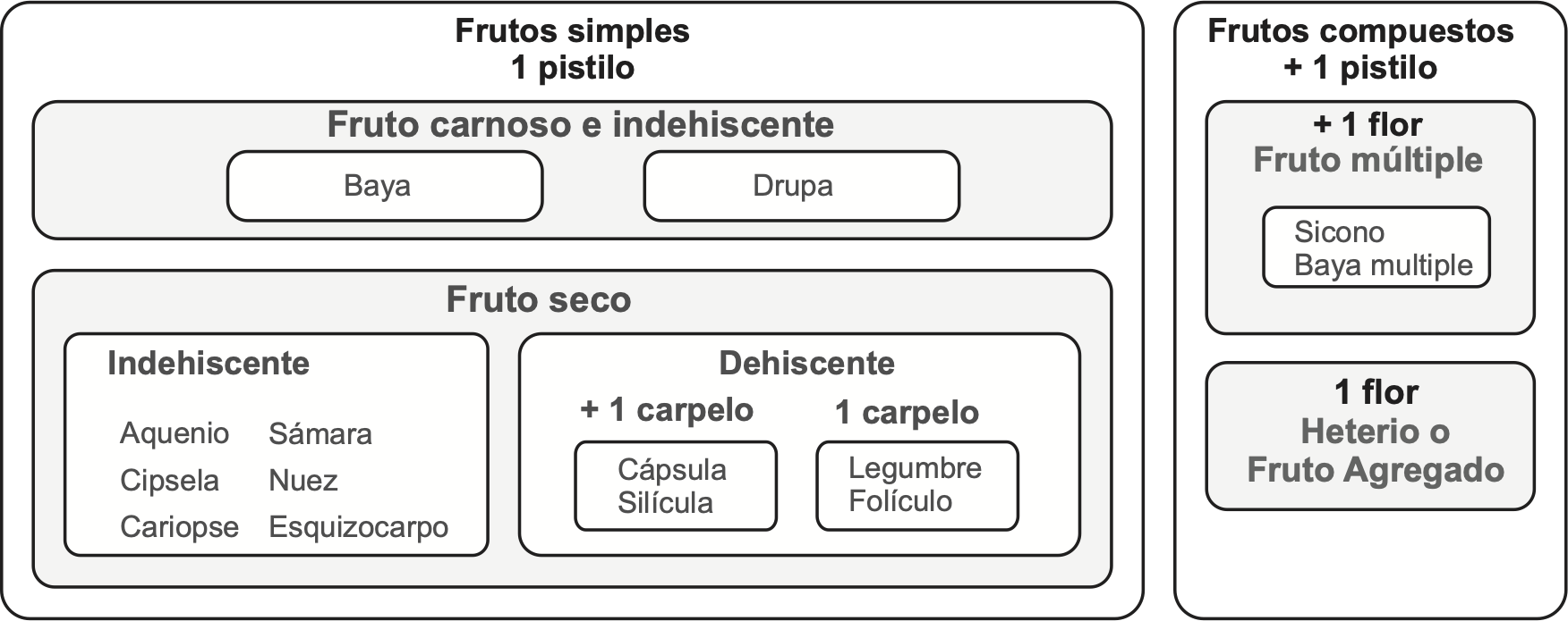 Los frutos simples, así como la unidad del fruto de los frutos agregados y múltiples, se clasifican en función de: