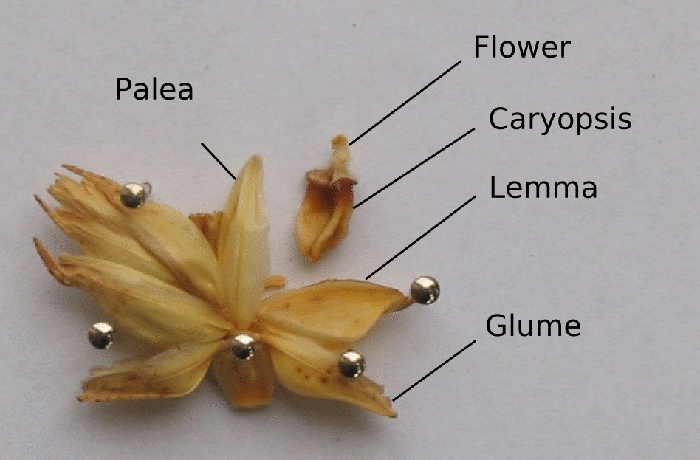 El fruto de Poaceae. Pequeño fruto seco de paredes delgadas, con una sola semilla fusionada con el pericarpio. Beentje (2016).