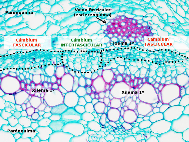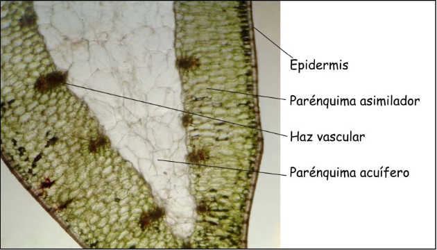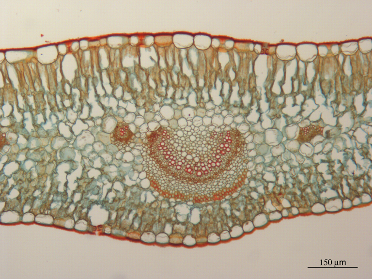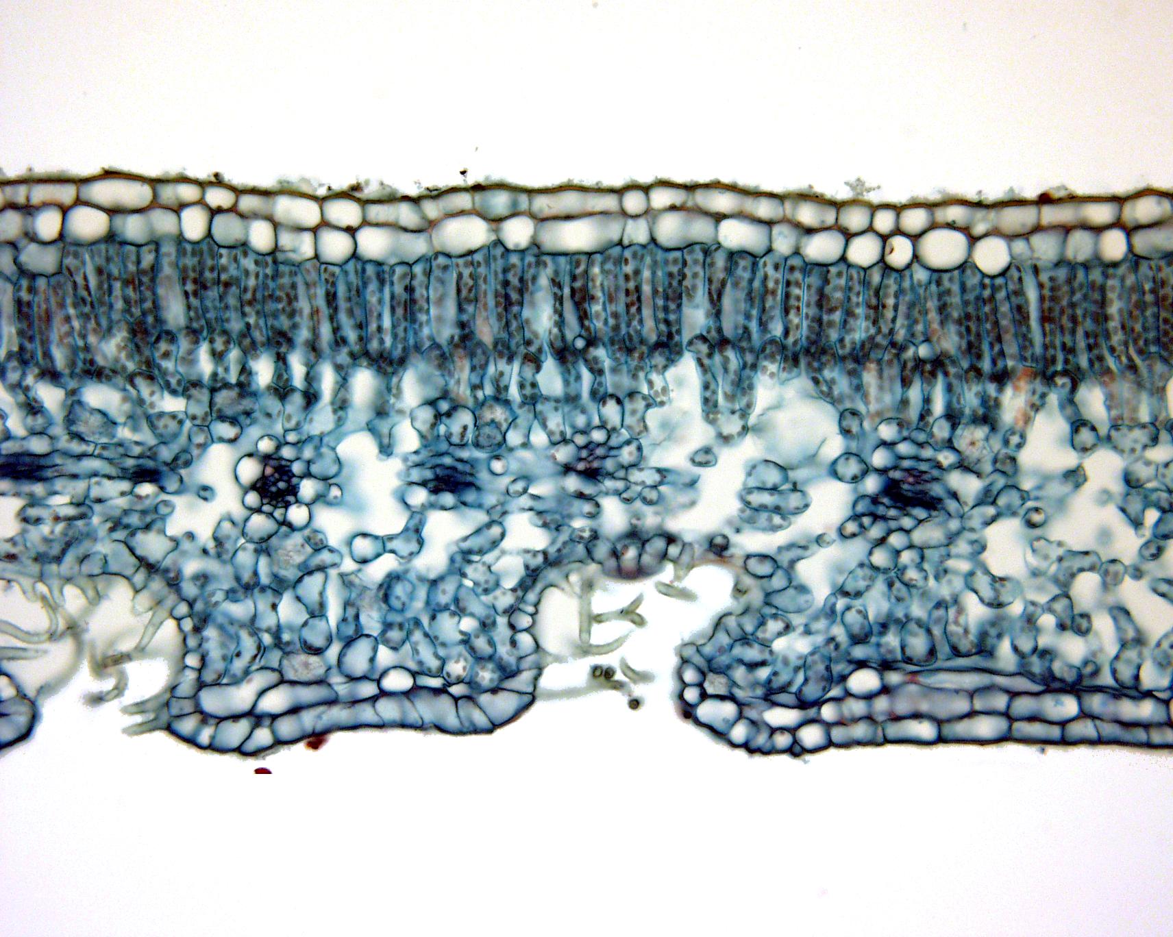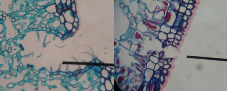 Corte transversal con Safranina y Azul Alcián de hoja de Nerium oleander. Repetir con Lugol.