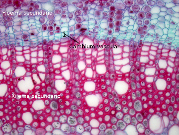 Corte transversal con Safranina y Azul Alcián de tallo de Aristolochia ringens.