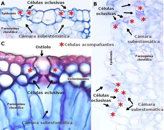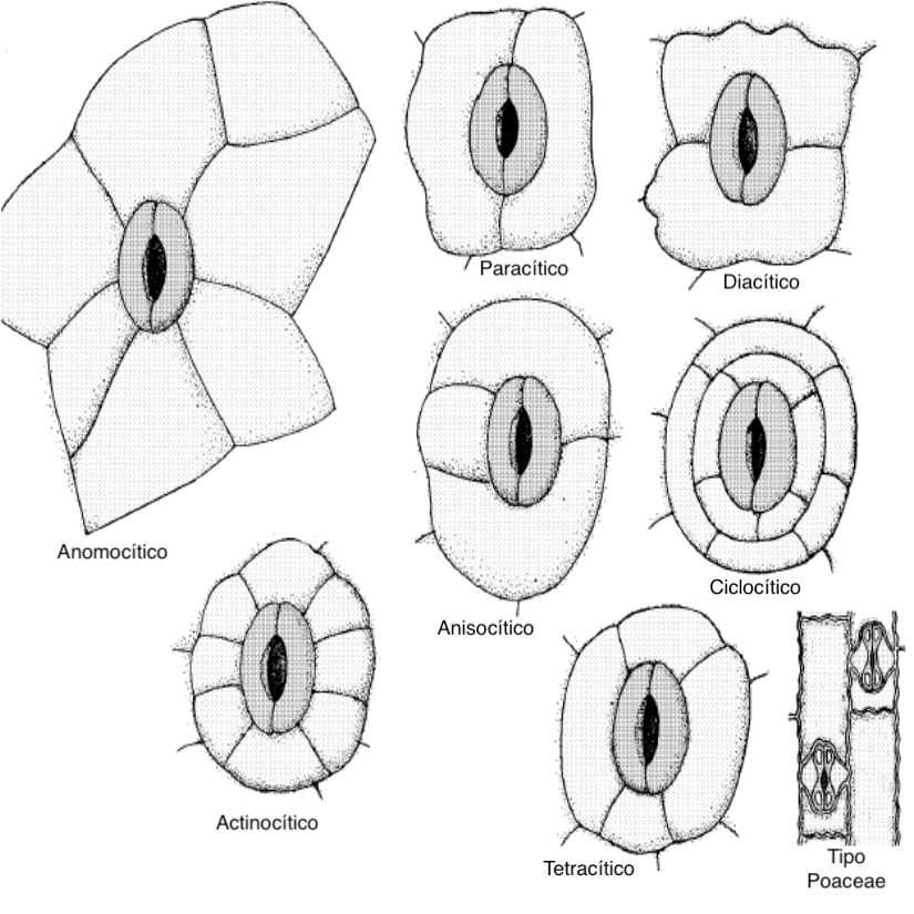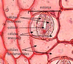Abertura en la epidermis de hojas y tallos, bordeada por dos células de guarda (oclusivas), que sirve para el intercambio de gases; también usado para referirse a todo el aparato estomático: las células de guarda más su poro (ostiolo) incluido. Evert (2006)
