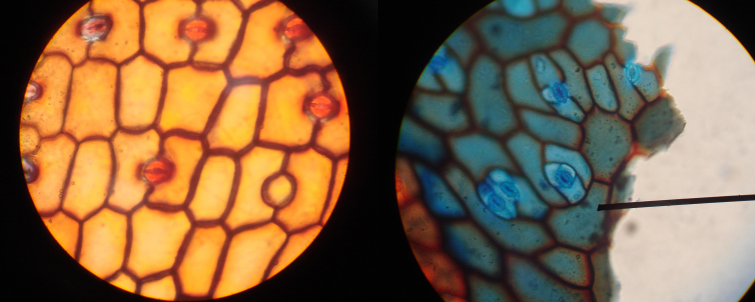 Corte longitudinal con Safranina y Azul Alcián de epidermis abaxial de hoja de Brassica oleracea, Coffea arabica, Dianthus caryophyllus, Tradescantia pallida, o cualquier otra planta.