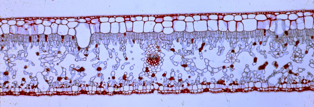 Corte transversal de hoja de Dianthus caryophyllus y Ficus elastica en fresco.