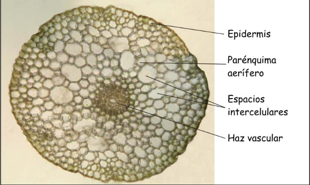 Corte transversal con Safranina y Azul Alcián de hoja o tallo de Cyperus papyrus, pecíolo de Canna sp. o talo de Egeria densa.