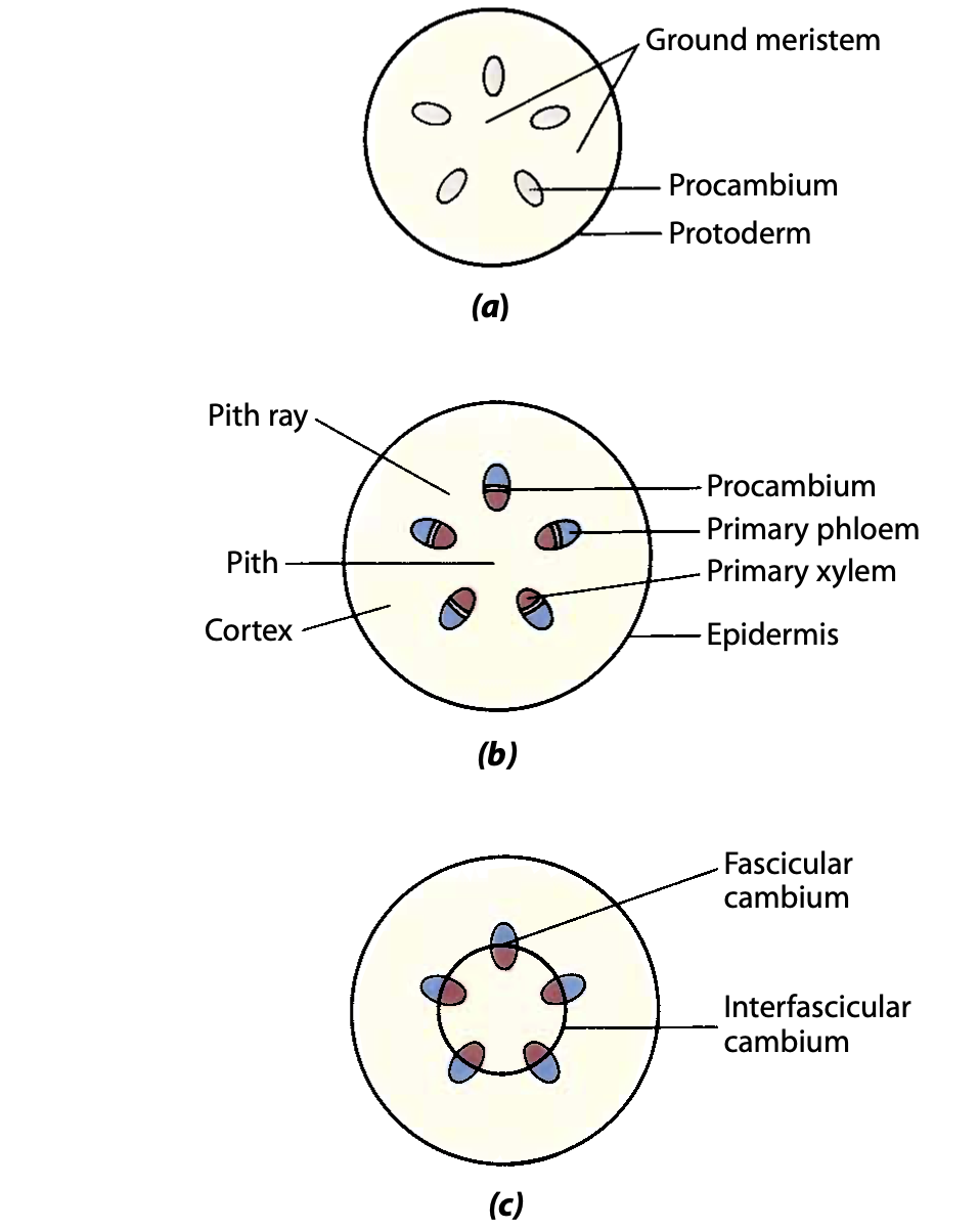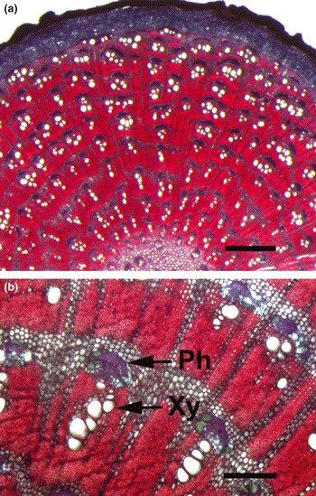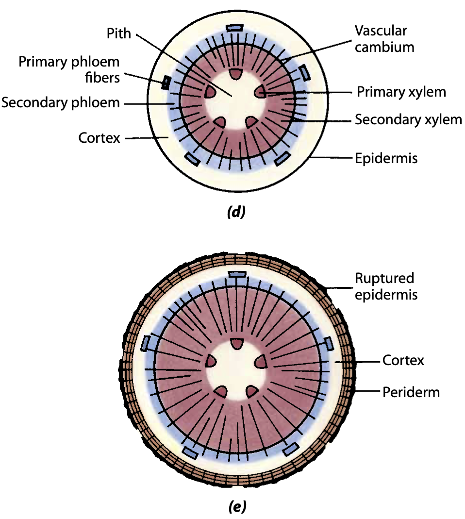Cortes transversales con Safranina y Azul Alcián de tallos de Gymnospermae y Eudicotyledoneae. Observe e identifique: súber, felógeno, felodermo, parénquima, floema secundario, cambium vascular y xilema secundario, además de los tejidos primarios que puedan quedar.